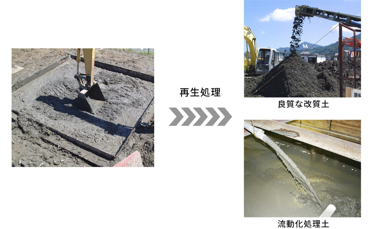 脱水ケーキから高含水の原泥土まで多様な汚泥を高品質の改質土や流動化処理土に再生します。